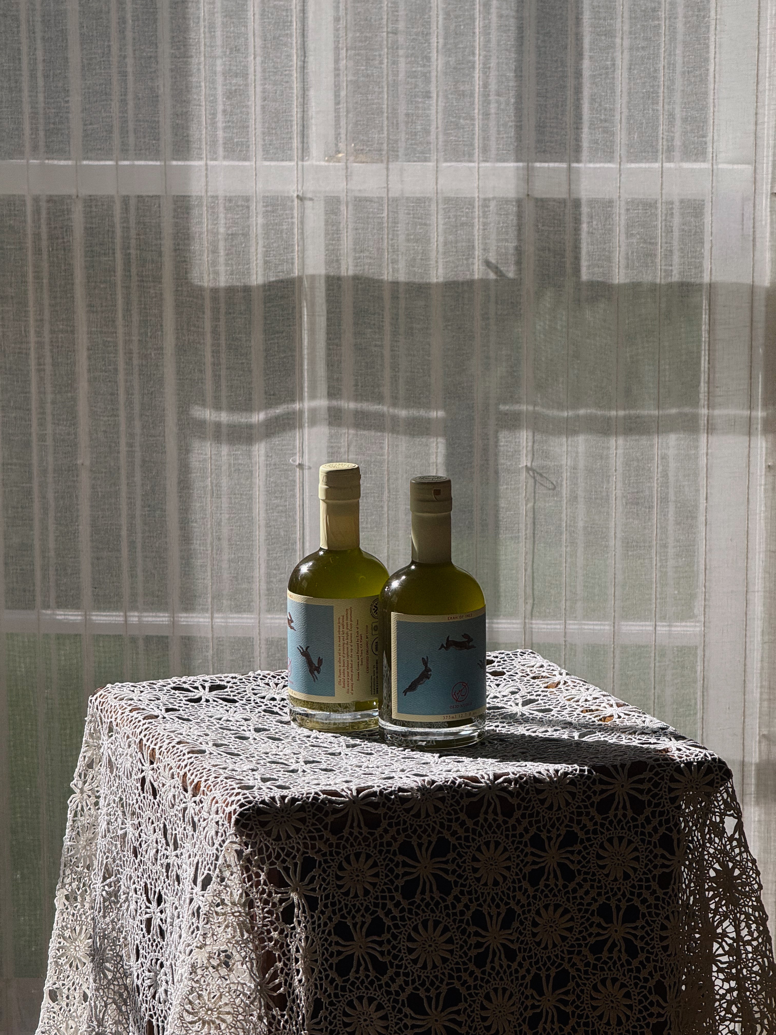 To honor our limited edition oil, we have adorned the bottles with a limited edition painting from Augustin's mom, artist Kathryn Freeman. The green of the oil provides a striking backdrop to our beloved hares jumping across a blue Santa Ynez sky.